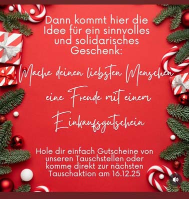 Kauft bei Aldi, Lidl, Kaufland oder Edeka einen Einkaufs-Gutschein im Wert von 50,- € und bringt ihn mit dem Kassenbon ins Freitagscafé oder zur Tauschbörse im Stern oder Café Krem! Ihr bekommt dann 50,- € in bar dafür!