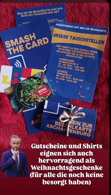 Du bist gegen inhumane Symbolpolitik und willst ihr mit deiner praktischen Solidarität etwas entgegensetzen? Das geht ganz einfach: Du kommst in unsere “Wechselstube” und tauschst dein Bargeld gegen einen Einkaufs-Gutschein (Aldi, Edeka, Kaufland o.ä.). Den Gutschein hat eine Person mit ihrer Bezahlkarte gekauft und dafür von uns Bargeld bekommen.