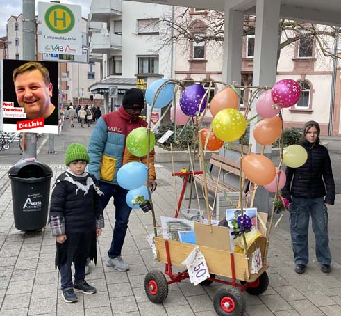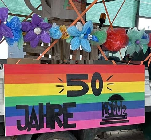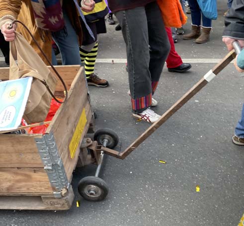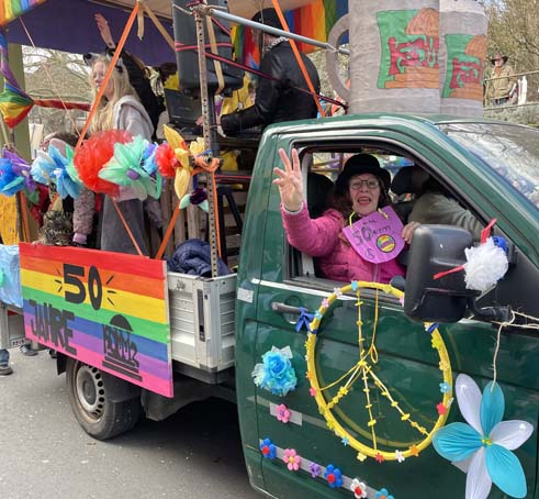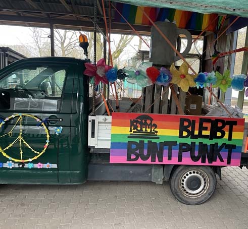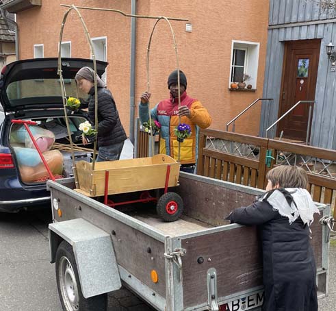 Aber unseren Wagen schmücken Blumen aus Recycle-Material. Danke an Marion und die fleißigen Helferinnen im Freitagscafé!